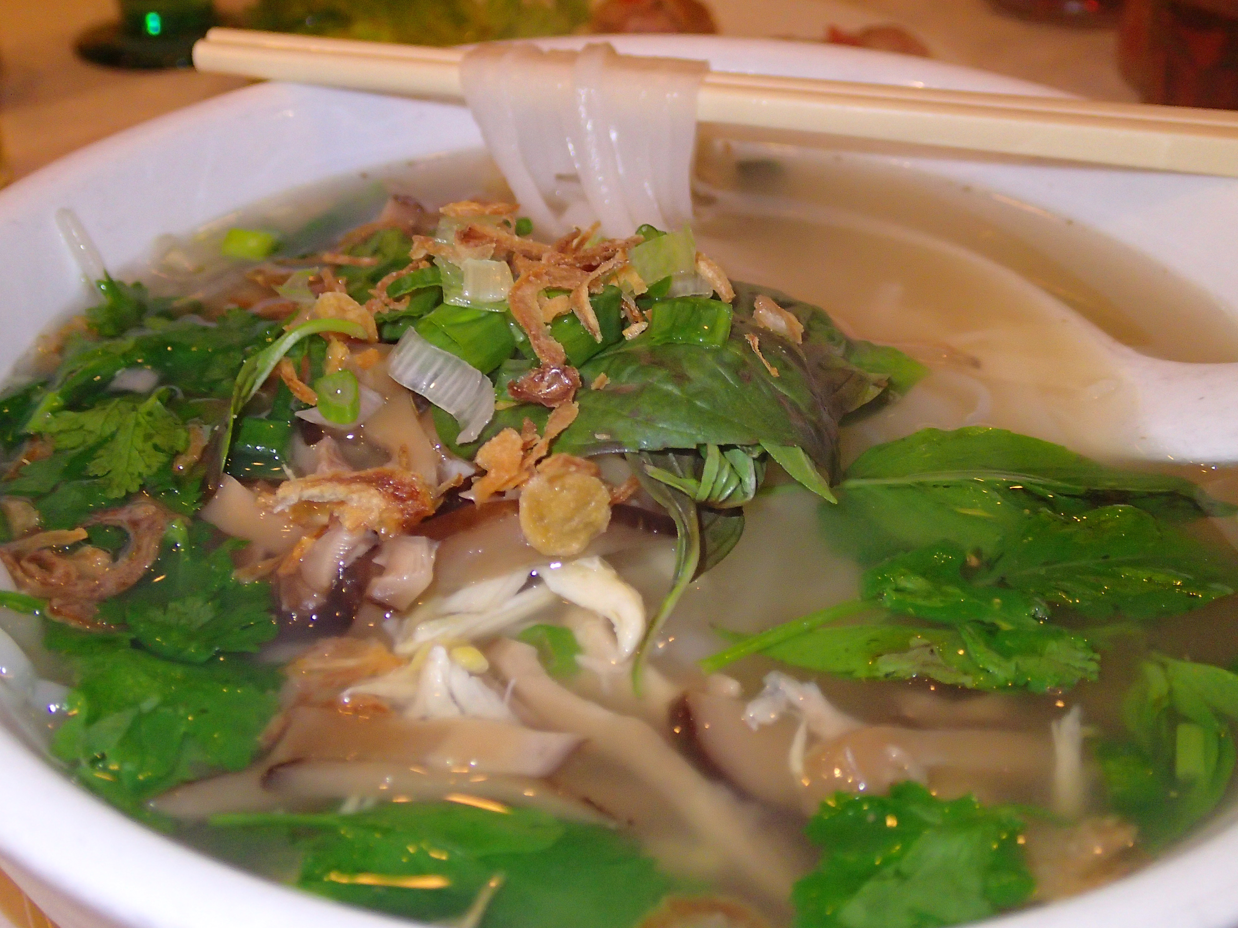 Interesting options are the Salt and pepper crispy eggplant, and the Barbecued Vietnamese five spice Cornish game hens. Pho is good here, with choices of beef, Asian salami, or chicken — a complex broth, generous noodles, bean sprouts, lemon grass, spring onion, fried shallots and a restrained sprinkling of herbs.