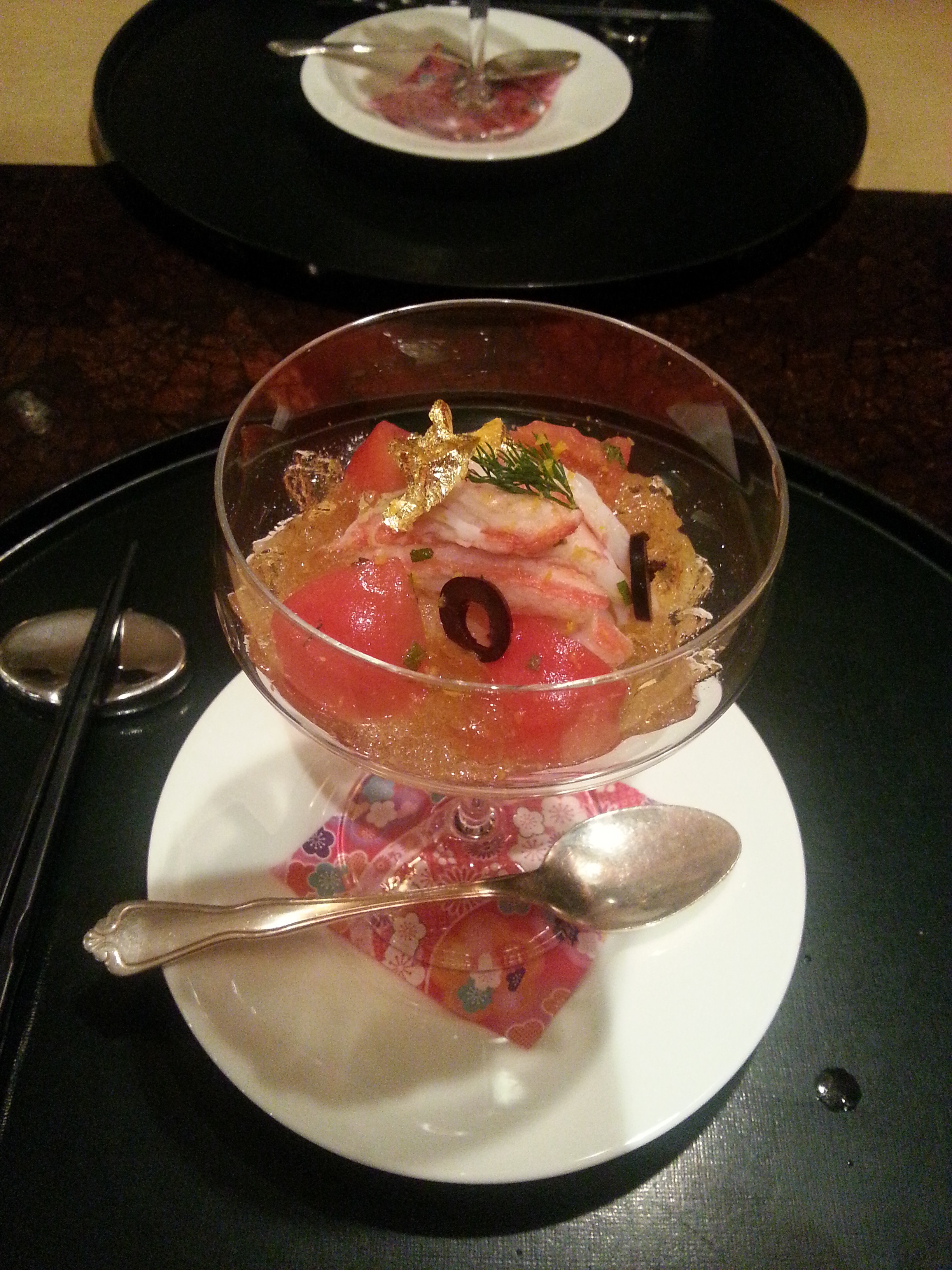We began with Chef Tsuji’s signature custard with fresh sea urchin and black truffle – divine!There is a generosity of spirit in chef’s dishes as seen here by the amount of uni and truffleA deluxe sashimi platter – everything ocean-fresh with outstanding flavourThis was followed by Simmered Japanese wagyu with seasonal vegetables in Yoshino style (Nadaman image)My favourite dish on the day – delicate, exquisite and memorable. Zuwaigani snow crab with Japanese tomato, capellini pasta and olives, shows the chef’s signature of introducing modern touches to traditional Japanese cuisine