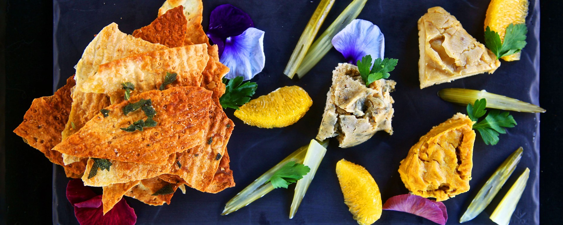 Image below ravioli featuring edible insects from Insects in the Backyard in Bangkok, cover image vegan ‘cheese’ plate from plant-based celebrity chef Matthew Kenney.